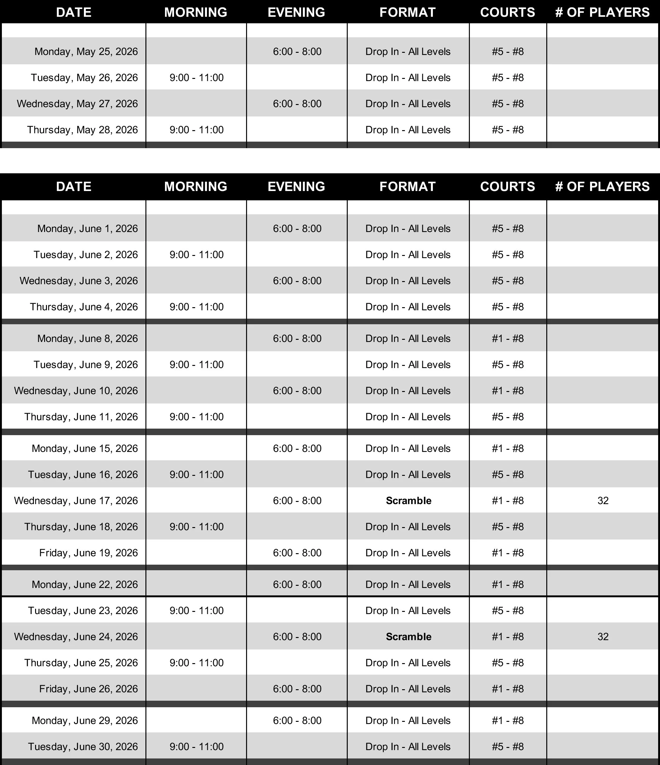 Summer club play schedule for the months of May-June 2026 at Hume Park.